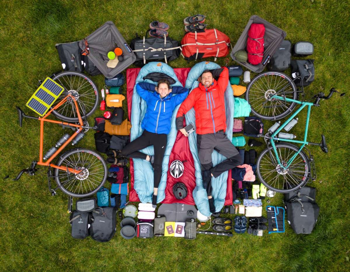 « La photo d’avant départ avec tous notre équipement pour un an de voyage. On a fait cette photo avec notre drone. »