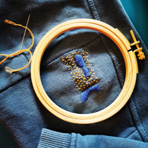 Là où nos grands-mères veillaient à réparer les vêtements de la manière la plus discrète possible, on exhibe désormais nos coutures : la broderie réparatrice devient un acte militant et créatif ! Jennyfer, aka Jen Brode, est convaincue par la beauté de la réparation visible. Inspirée par les valeurs de l’Atelier des Nouveaux Designs, association lyonnaise dédiée à l’upcycling et à la revalorisation des matières destinées à être jetées, elle y anime des ateliers broderie et se forme à la réparation : « Il faut que l’on donne une seconde vie aux vêtements ! Que l’on fasse durer, que l’on arrête de jeter des jeans parce qu’ils ont un petit trou ! » C’est plus spécifiquement la réparation visible qui l’enthousiasme. Un art que les anglo-saxons nomment « visible mending ».